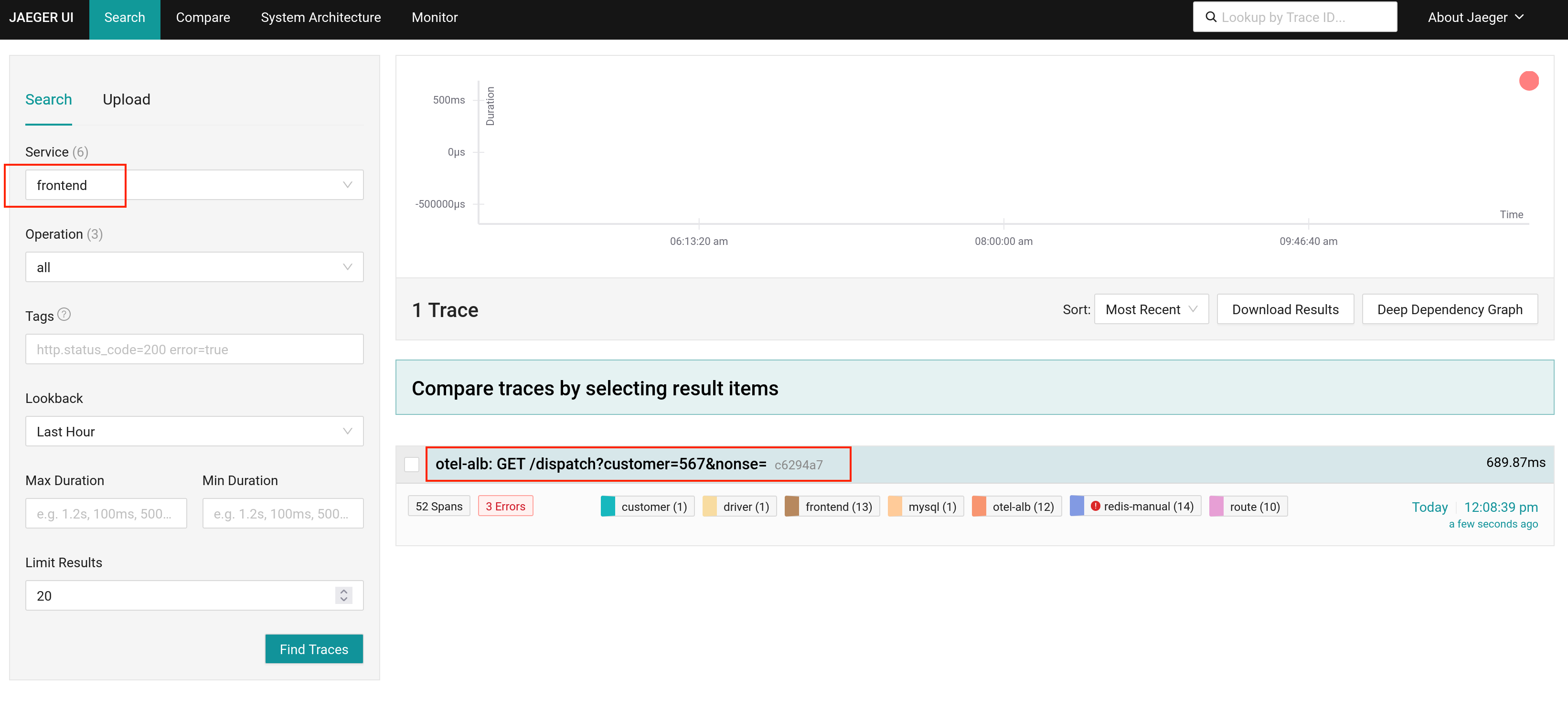 Execute the following command to send a request to HotROD via ALB. Here, ALB will report the Trace to Jaeger.